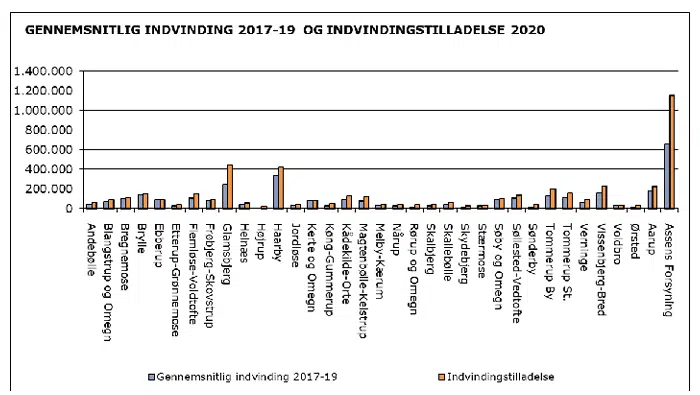 I grafen nedenfor er vandværkerne sammenlignet på grundlag af deres gennemsnitlige vandindvinding 2017-2019 og gældende indvindingstilladelser i 2020. (Holmehaveværket er udeladt af hensyn til skalaen, men har en gennemsnitlig indvinding på 3.870.083 m3/år (2017-2019) og en tilladt indvinding på 5.500.000 m3/år).