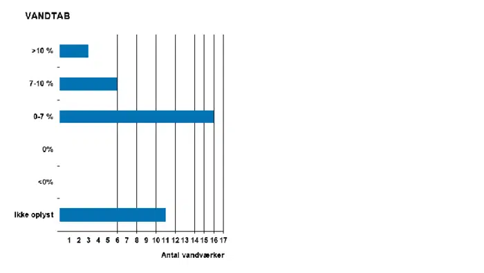 Nedenfor er vandtabet opgjort i procentvise intervaller for de almene vandværker. Knap halvdelen af vandværkerne har et vandtab mellem 0-7 %. I tre forsynings-områder er vandtabet større end 10 % mens 11 vandværker ikke har oplysninger om deres vandtab.